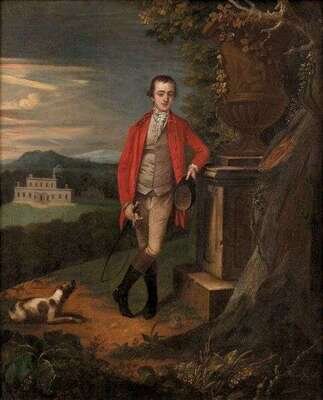 CIRCLE OF ARTHUR DEVIS (BRITISH 1711-1787) HUNTSMAN AND HIS HOUND BY AN URN IN A LANDSCAPE
