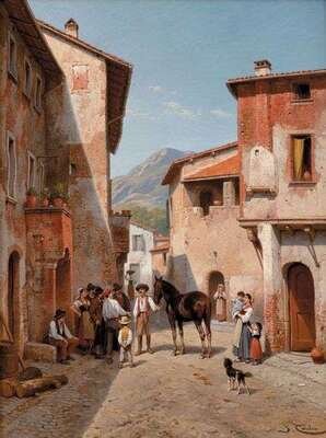 JACQUES FRANCOIS CARABAIN (BELGIAN 1834-1889) VILLAGERS IN A SUNLIT STREET
