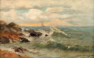 KONSTANTIN ALEKSANDROVICH WESTICHILOFF (RUSSIAN 1877-1945) SAILING SHIPS OFF A ROCKY COASTLINE AT SUNSET