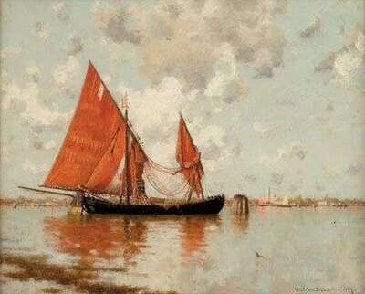 WALTER BLACKMAN (AMERICAN 1847-1928) FISHING BOAT AT ANCHOR