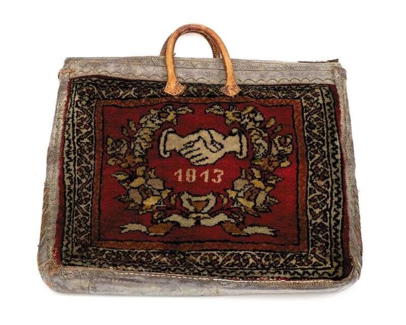 Each woven into a single two-handled bag. One side with a wreath centering shaking hands and bearing the date "1813"; one with a wreath centering an inscription. Displayed in a contemporary plexiglass shadowbox.
