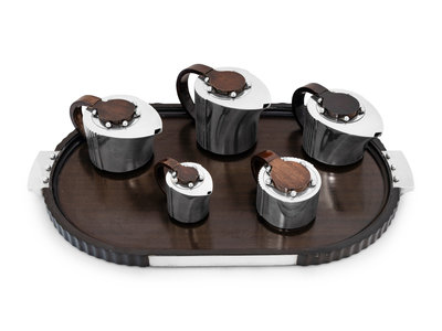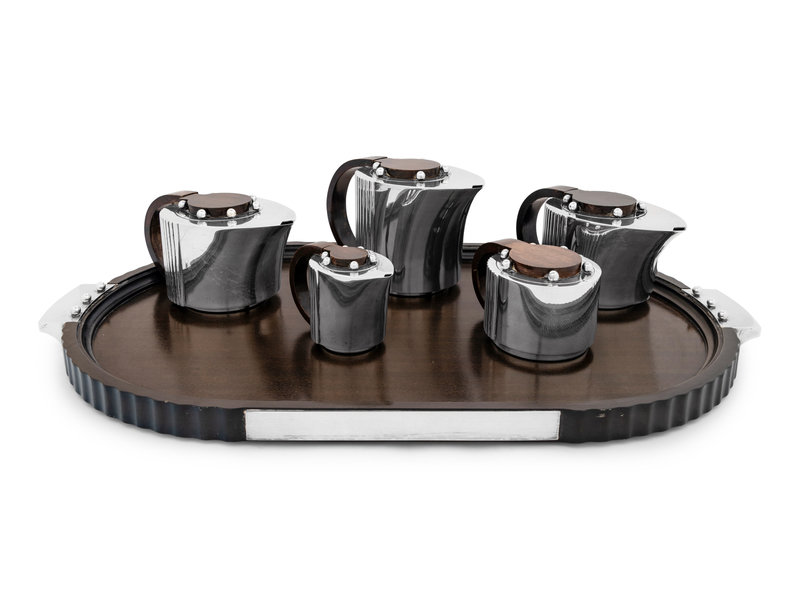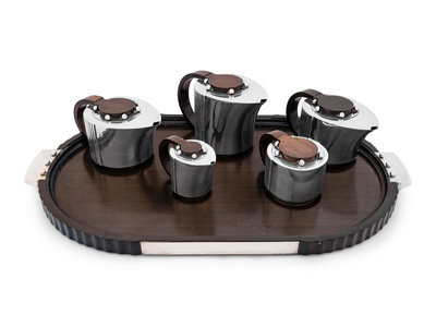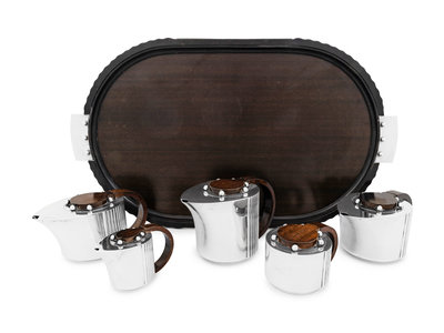 comprising teapot, coffee pot, water kettle, creamer, covered sugar and serving tray.