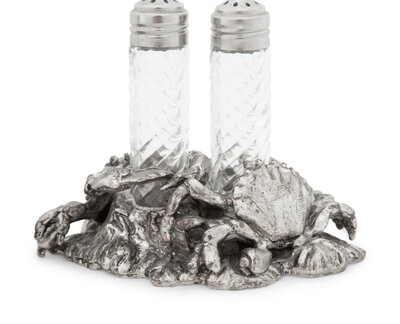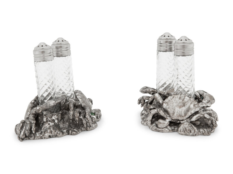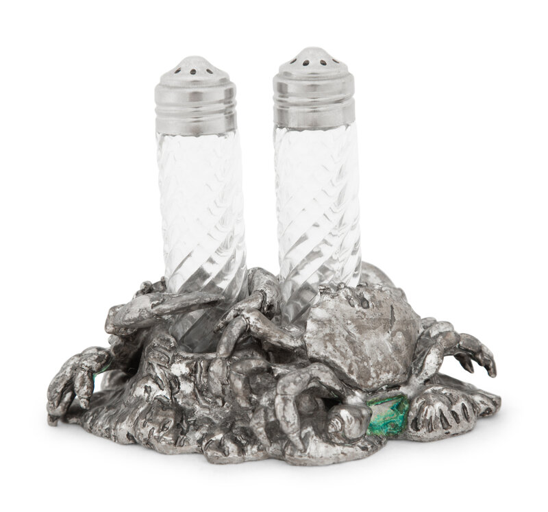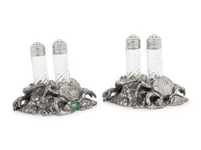 A Silvered Metal and Cut Glass 'Crab' Shaker Set