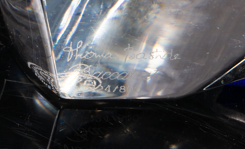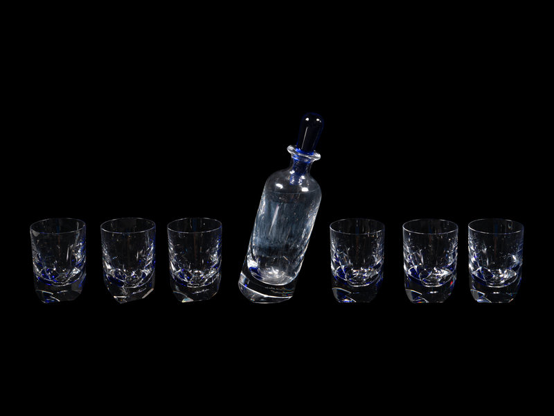 comprising a decanter with stopper and six rocks glasses; the decanter signed Thomas Bastide / Baccarat and further numbered 124/800 to the base; each glass bearing acid-etched mark to the underside and marked TB to the base.