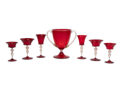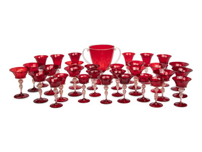 comprising 6 water goblets, 12 large coupes and 12 smaller coupes; together with a later, similarly decorated vase; 31 items total.