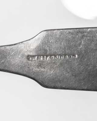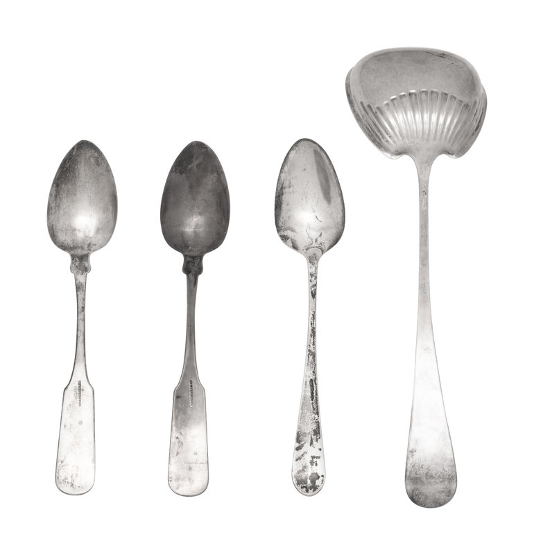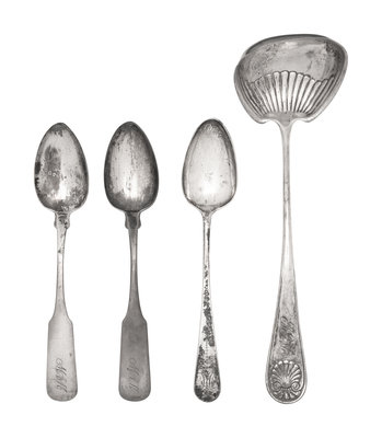 comprising a tablespoon marked for Christian Wiltberger, Philadelphia, PA, c. 1795; a pair of coin silver table spoons marked for T. Chandler; and a soup ladle marked for Whiting Mfg. Co., New York, NY.