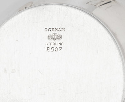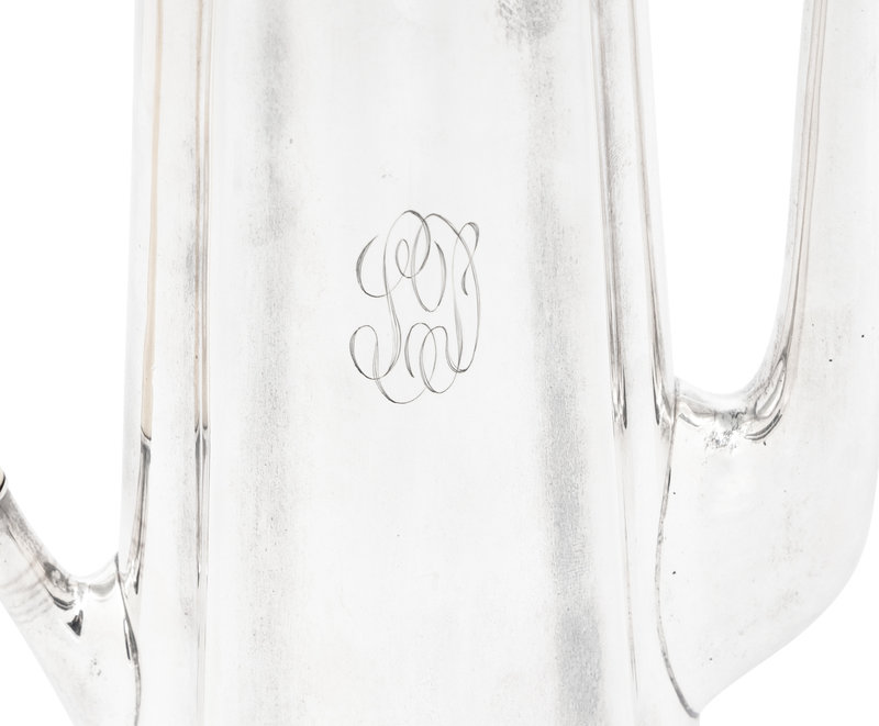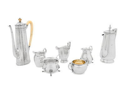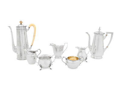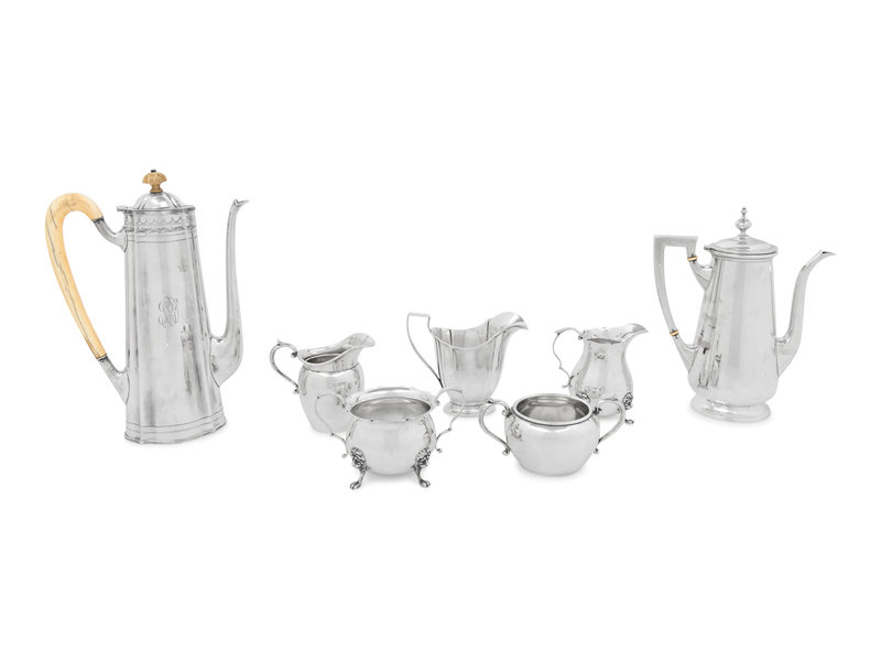 comprising a coffee pot with an engraved monogram on bodymarked for Tuttle Silversmiths, Boston, MA, 19th/20th Century; a coffee pot marked for Redlich & Co., New York, NY, 20th Century; a creamer marked for R. Wallace & Son., Wallingford, CT, 20th Century; a creamer and sugar set marked for Gorham Mfg. Co., Providence, RI, 20th Century; and a creamer and sugar set marked for Prill Silver Co., New York, NY, 20th Century.