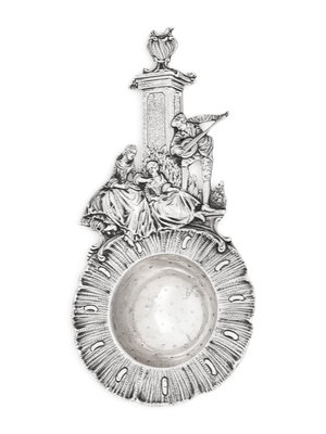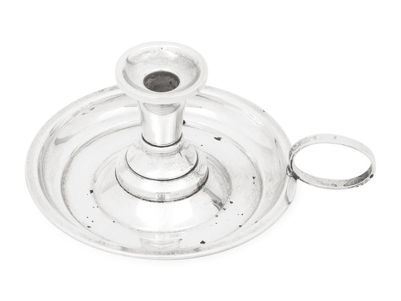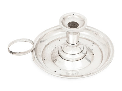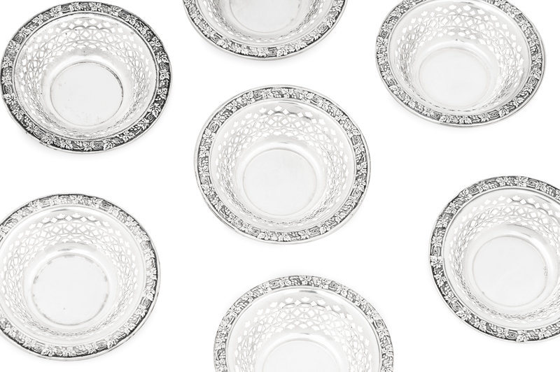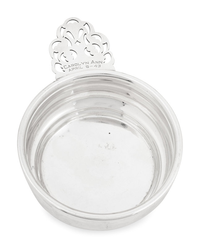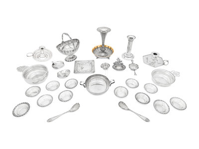 comprising a set of twelve nut dishes; pair of ash trays marked for Richard Dimes, South Boston, MA; sugar basket marked for William Gale Jr., New York, NY; porringer marked for Ensko, New York, NY; two other porringers, silver-gilt table vase marked for Gorham; candle stick marked for Goodnow and Jenks, Boston, MA; two chamber sticks; a candy dish; three strainers; and a cased pair of coin-silver sugar scoops; 28 items total.