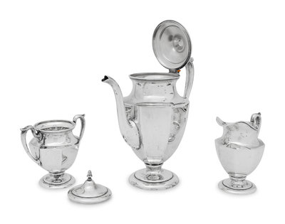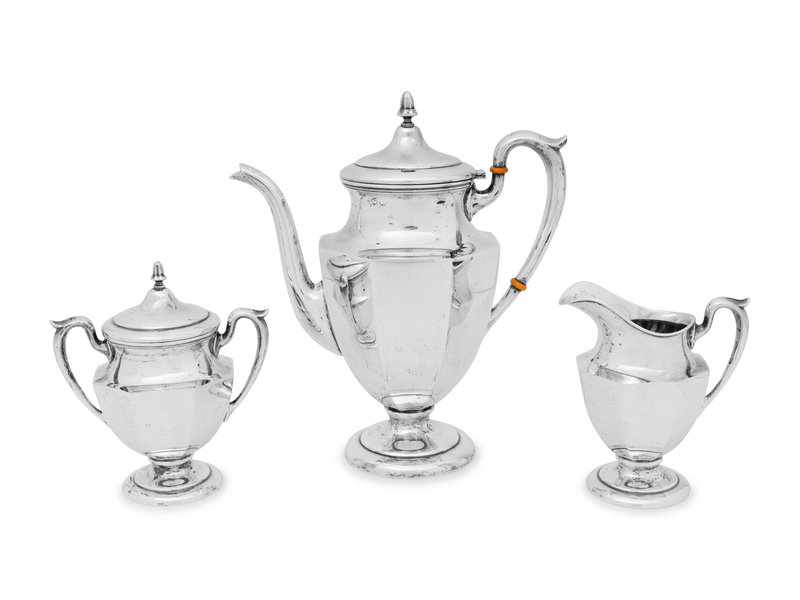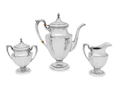 Colonial pattern, comprising a coffee pot, creamer and sugar.