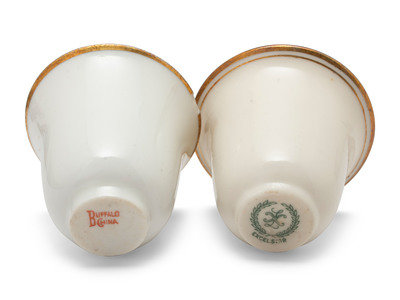 Height of cups with liners 2 1/4 inches; diameter of saucers 3 1/2 inches.