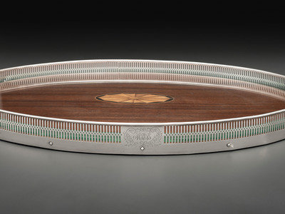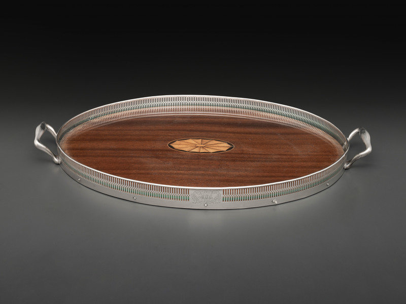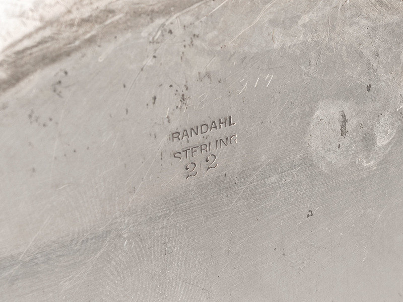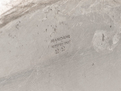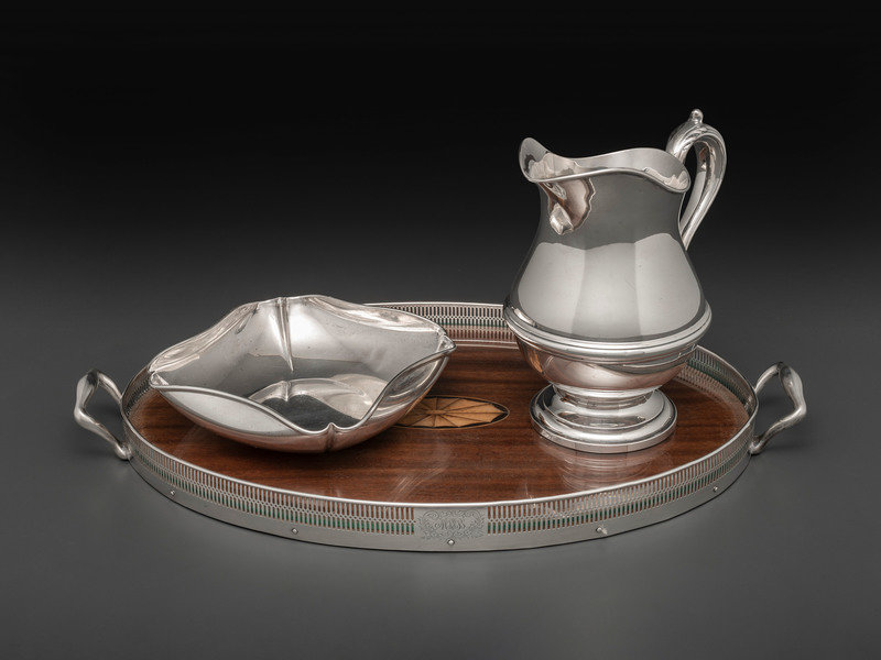 comprising a Redlich & Co. pitcher, a Randahl bowl and a Frank Whiting tray with inlaid wood base.