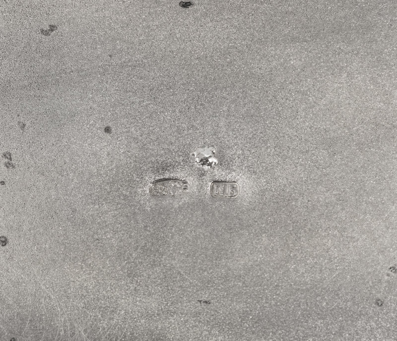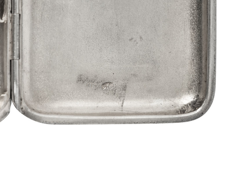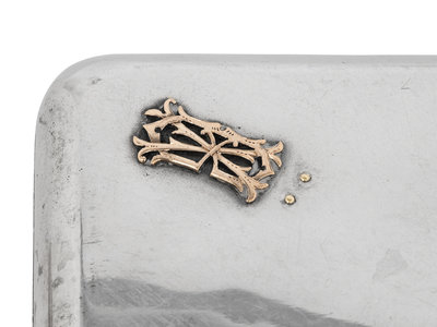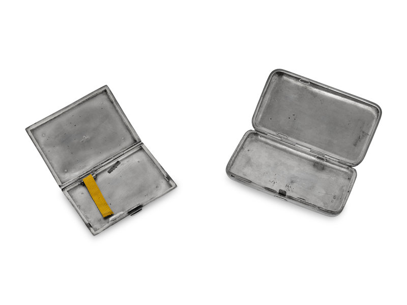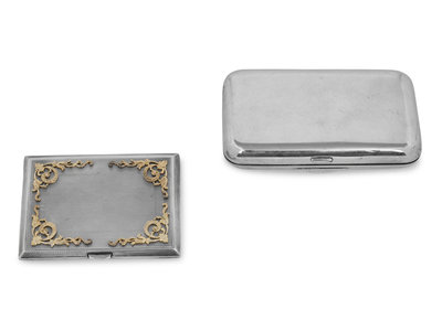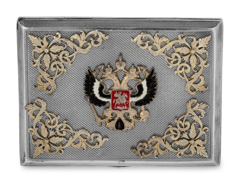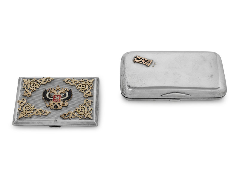 comprising an example with a lid centered with an applied enameled double-headed eagle surrounded with gilt-decorated rinceau elements, the other example with an applied monogram charm.