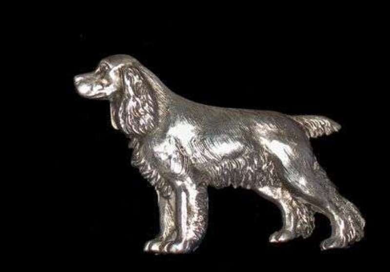 A sterling silver springer spaniel pin designed by R.E. Bishop and sold by J.E. Caldwell.
