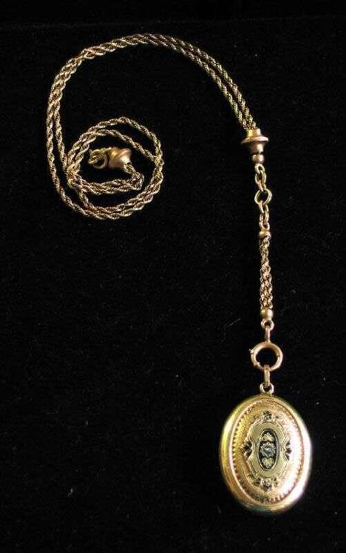 An oval yellow gold and black enamel decorated locket, chain with two slides.