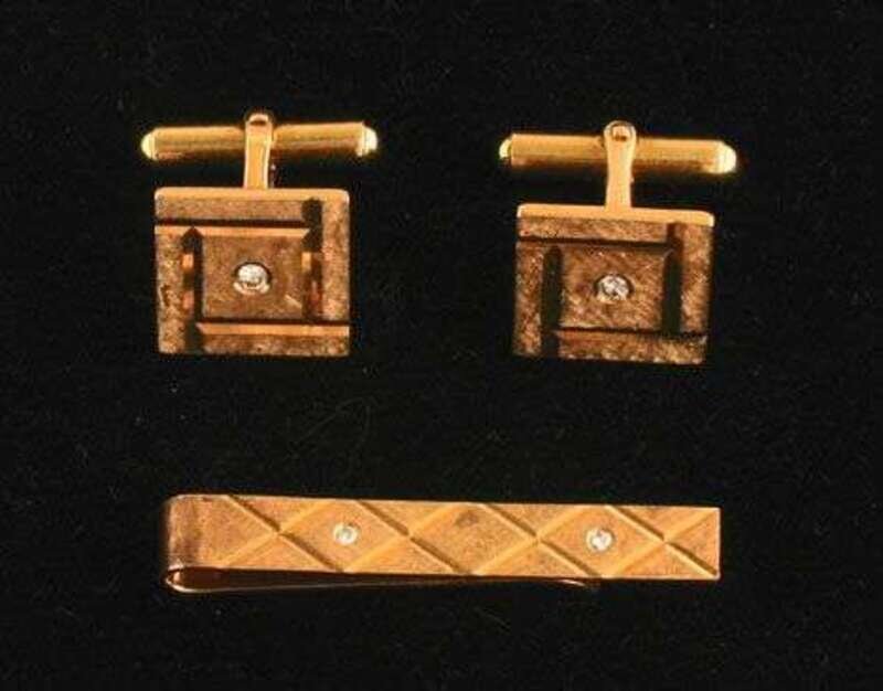 14 karat yellow gold and diamond men's cufflinks and tie bar