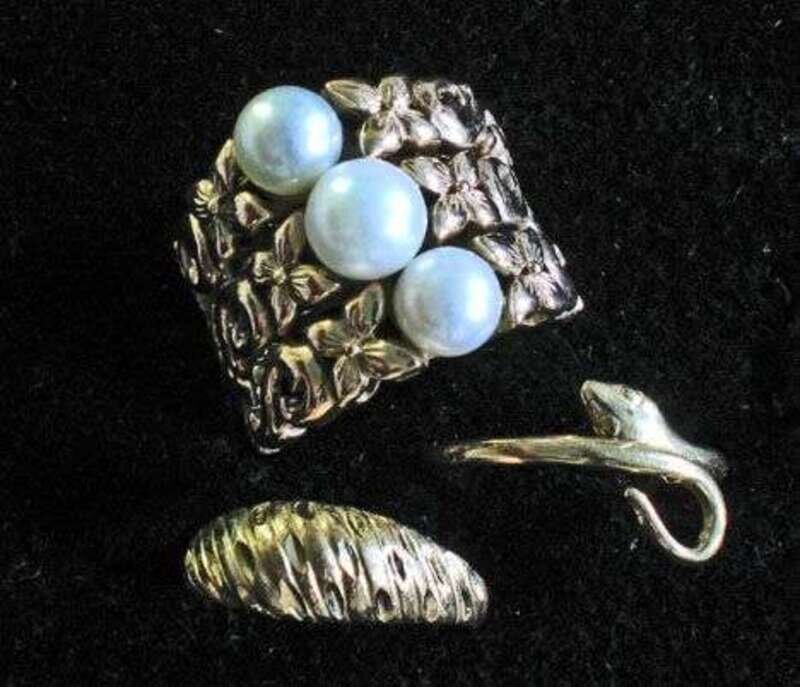 Including: one with three pierced bands and three cultured pearls, one serpent swirl form ring, and one 'ribbed' band. (3 pieces).