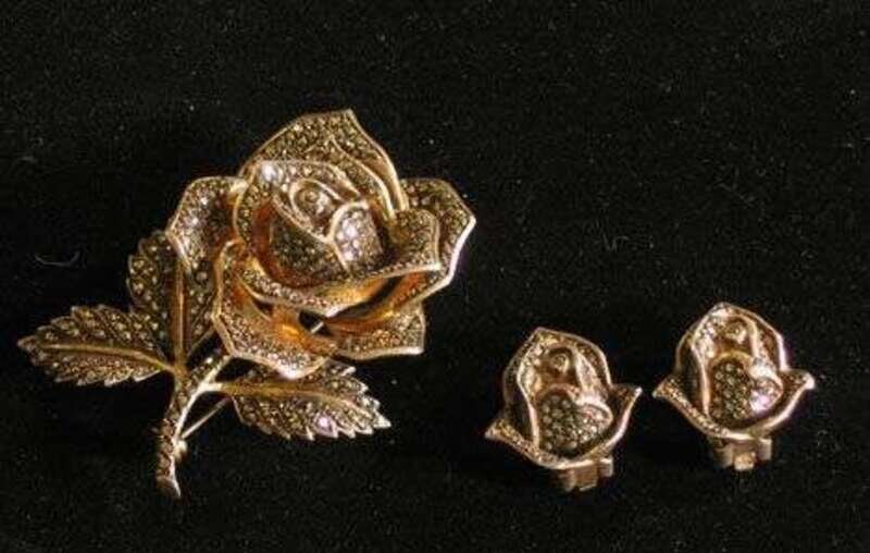 Heavy German silver and marcasite "rose" pin and matching earrings