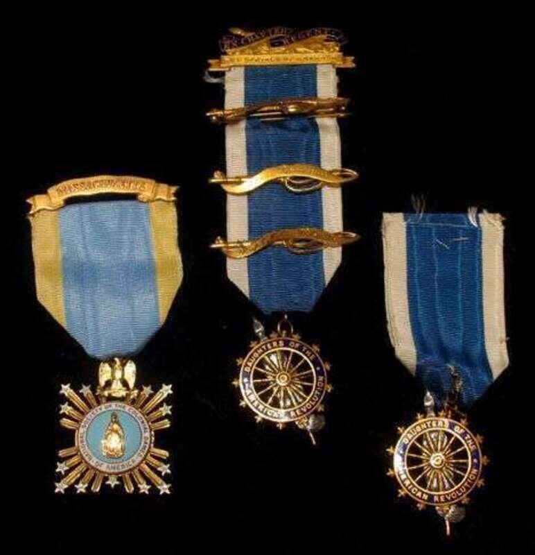 Having striped ribbon with chapter designation, together with three name banners and a wheel pin in 14 karat yellow gold, and two additional pins with cloth drops.