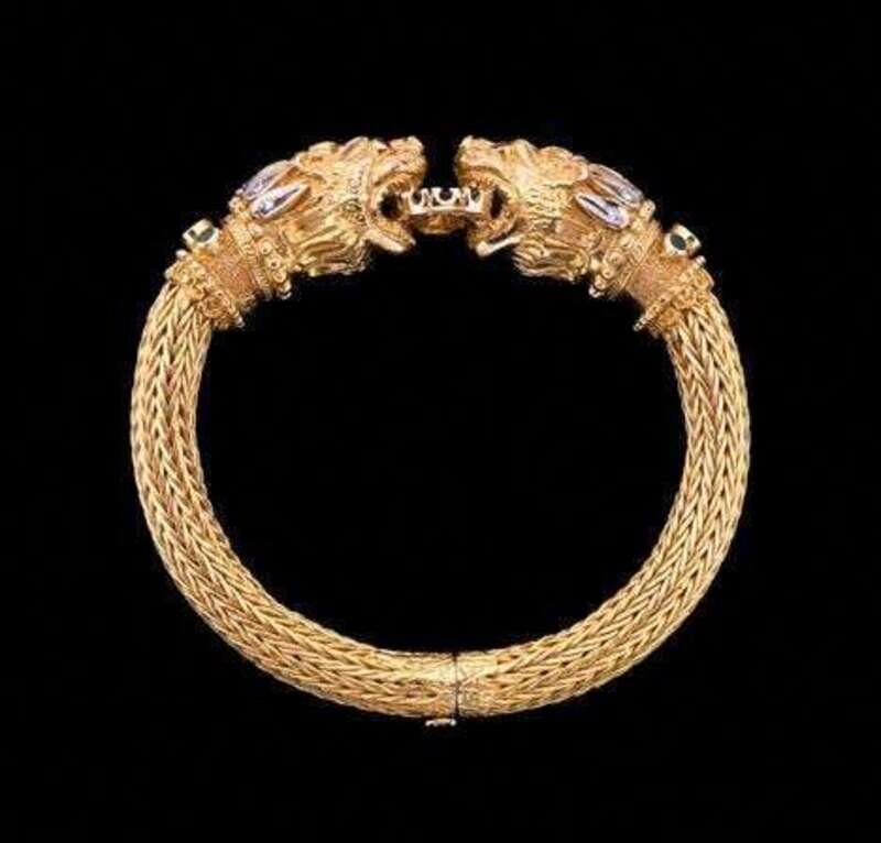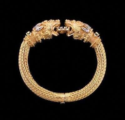 Yellow gold stiff chainwork bracelet with two lion heads. Heads set with twelve sapphires and two ruby eyes, and seven diamonds on neck.