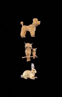 Designed as a poodle, owl and rabbit, in 18k gold.