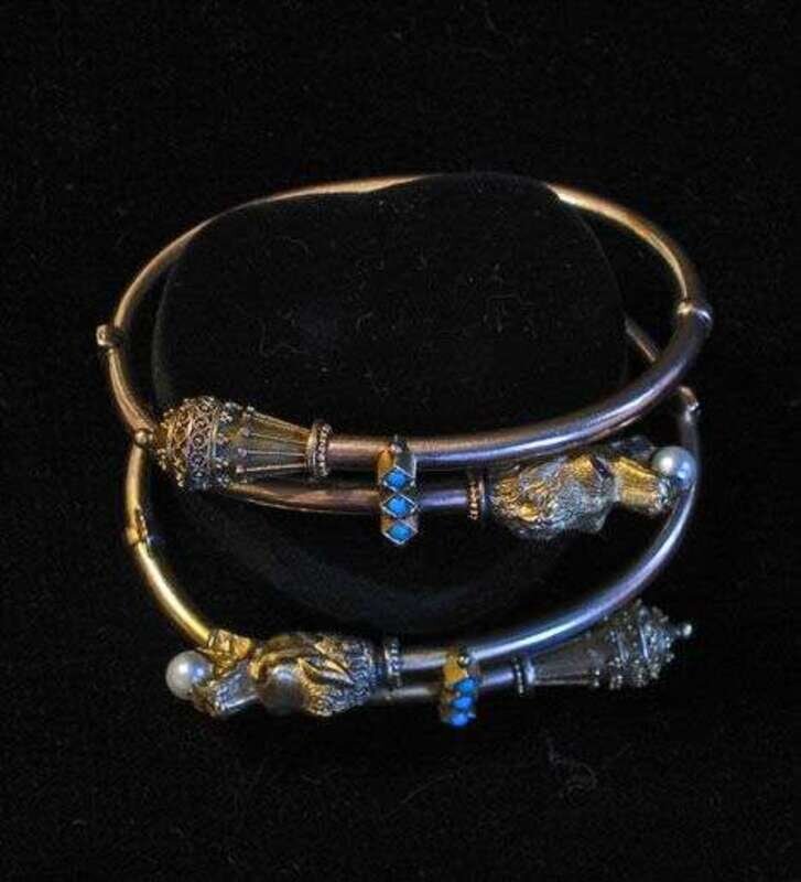 Etruscan Revival bracelets composed of a wolf's head end with ruby eyes and a single pearl in its mouth with a lantern on the other end.