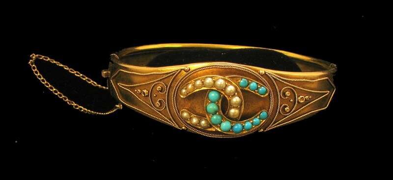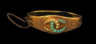 One horseshoe with seed pearls, the other with small turquoise beads.