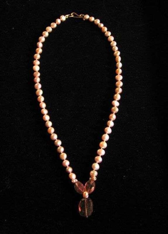 Composed of 56 pink pearls and three oval panels of rose quartz.