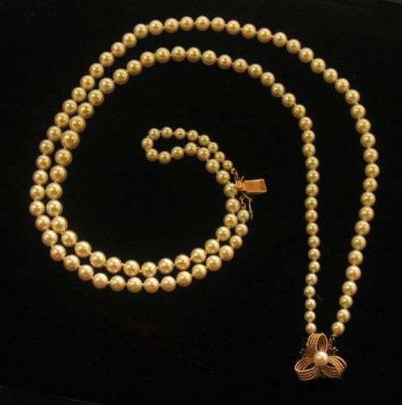 Composed of one hundred and thirty-five cultured pearls ranging from 4mm to 8mm. With a 14 karat yellow gold and "sapphire" clasp.