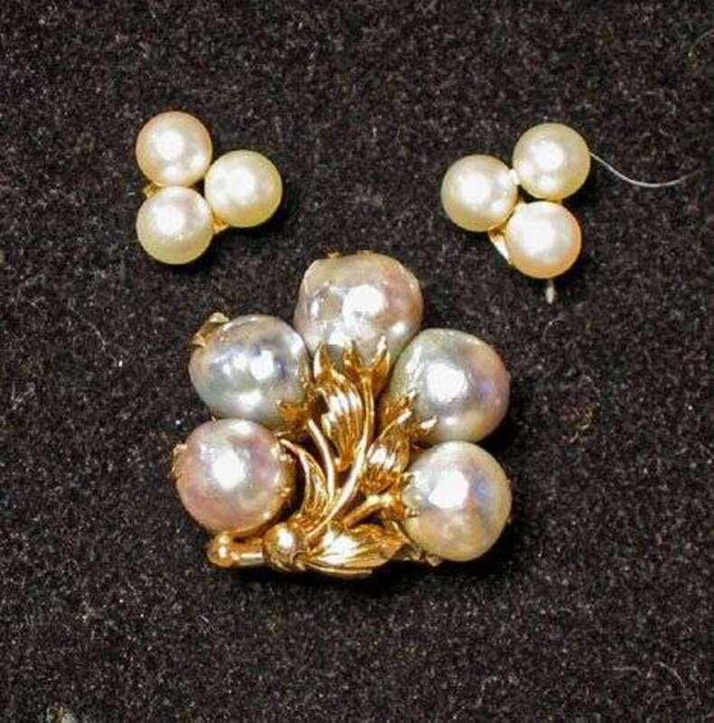 Set with five grey pearls abour 8.5 mm each together with a pair of yellow gold earrings set with three cream pearls each.