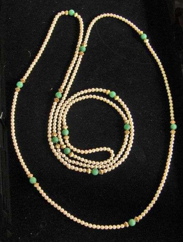 Composed of fourteen 7 mm jade beads, three hundred and thirty-six 4 mm pearls and twenty-eight gold rondels.