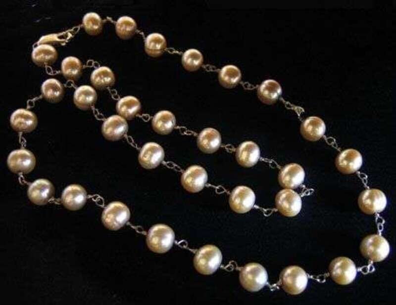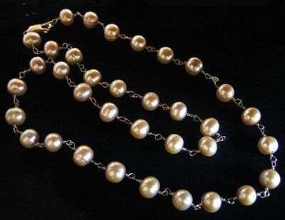 Composed of thirty-five 7.5 mm "golden" cultured pearls, having a 14 karat yellow gold clasp.