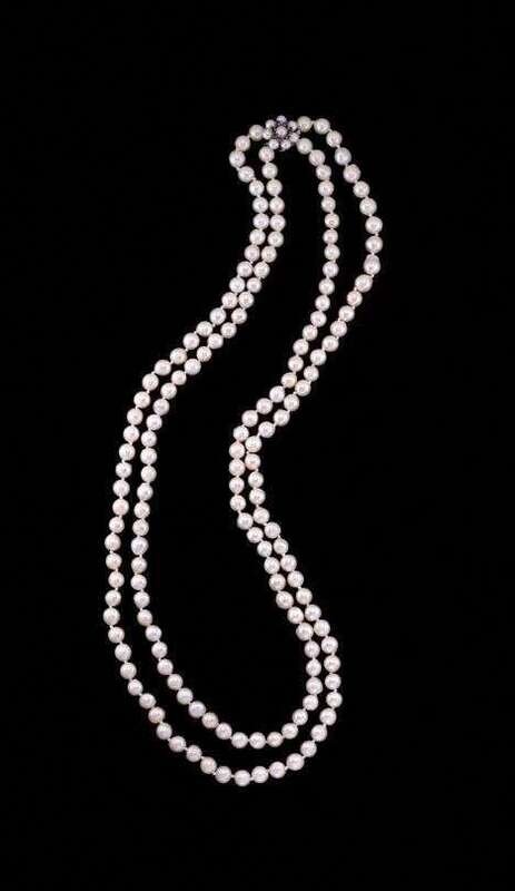 Composed of one hundred seventy-one, 8 mm pearls with a pearl and sapphire clasp.