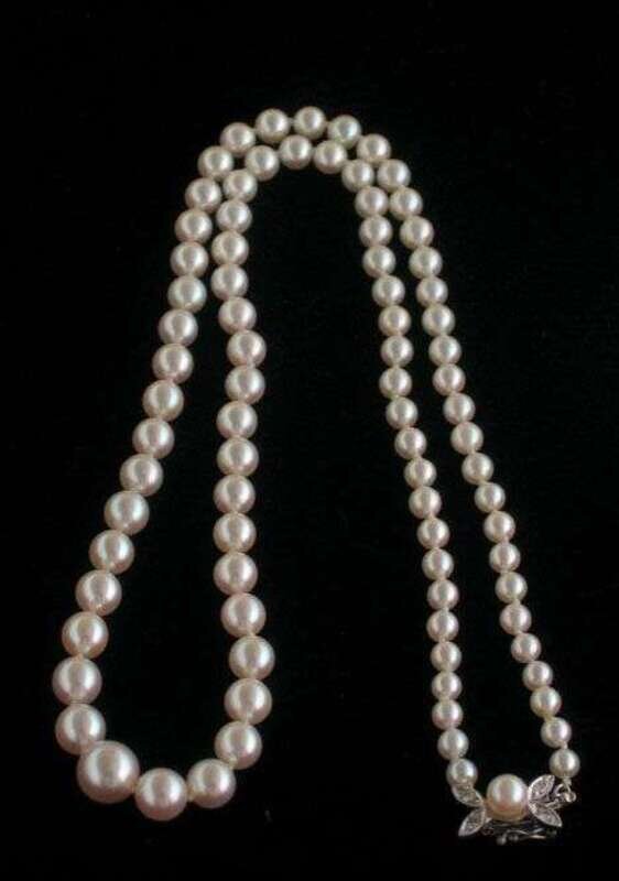Comprised of 84 graduated cultured pearls, ranging from 4 mm to 8 mm. WIth a 14 karat white gold, pearl, and diamond clasp.
