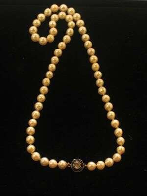 Composed of fifty-eight 7.5 mm cultured pearls, circular white gold clasp set with a round "rose" diamond and calibre cut sapphires.