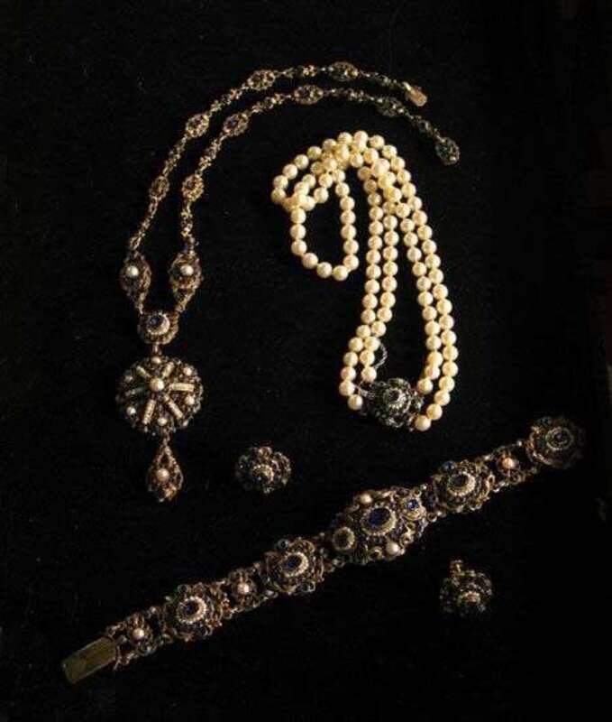 Victorian design gilt metal sapphire and pearl jewelry
