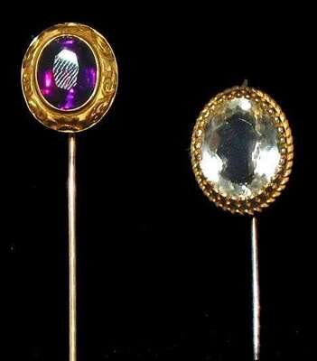 One large faceted amethyst with decorated gold surround and another with a large faceted clear stone in a gold filigree setting.