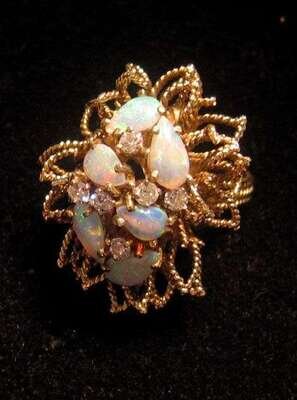 Openwork setting with four pear shaped opals and one oval opal with six round diamonds.