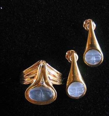 14 karat yellow gold carved moonstone ring and pair of earrings