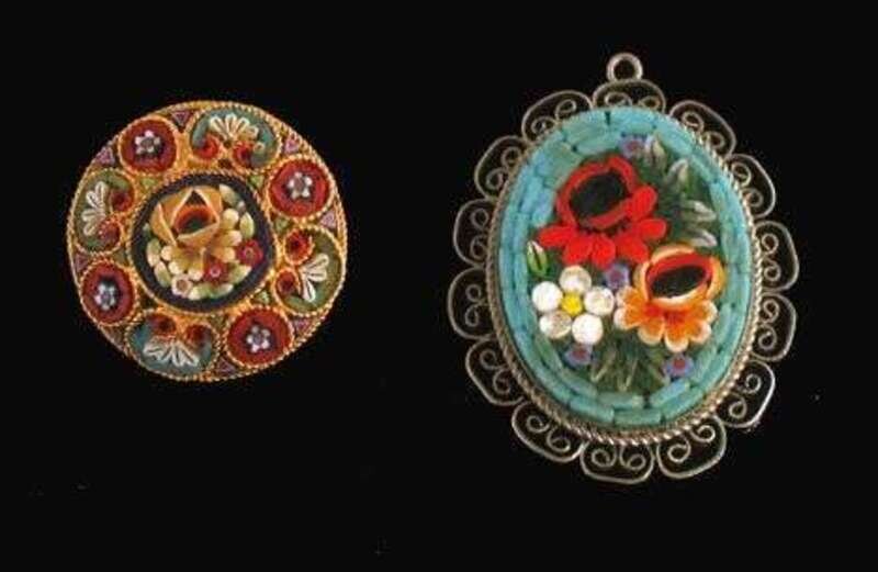 Having circular floral center surrounded by eight floral medallions together with a micro-mosaic floral lavaliere.