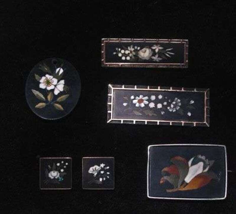 Three set with a rectangular metal frame with floral motif, two oval pendants (drilled), four pieces total.