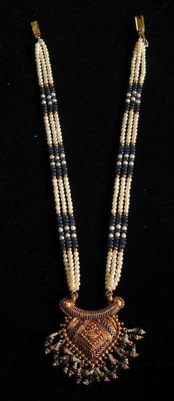 Lapis bead, seed pearl and 22 karat yellow gold necklace with openwork gold pendant.
