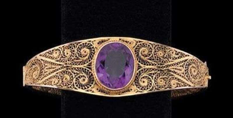 A yellow gold and oval faceted amethyst bangle with filigree band.