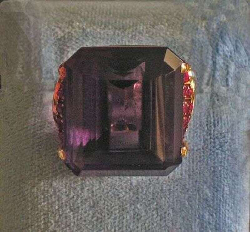 Set with a large rectangular cut amethyst with ten small pink side stones.