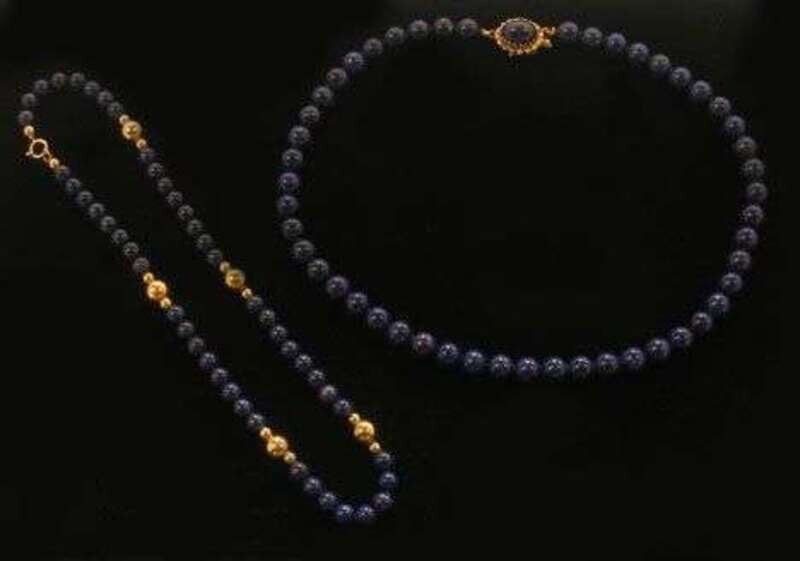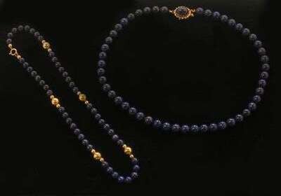 One in 8mm lapis beads with a lapis and 14 karat yellow gold clasp, the other with 6mm lapis beads and five gold beads.
