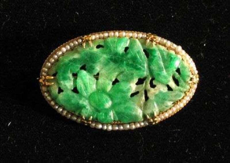 14 karat yellow gold, oval jade and seed pearl Art Deco pin circa 1920