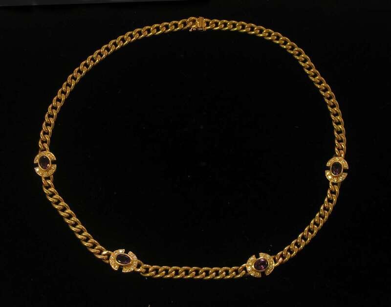 Oval links set with four oval facet cut amethysts and forty round diamonds.