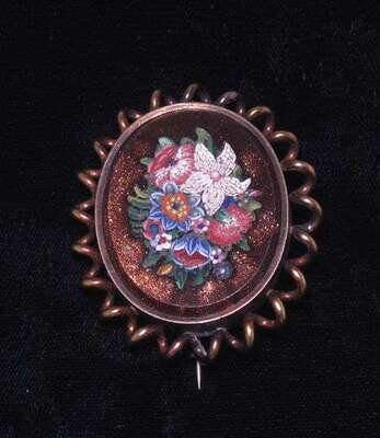 Polychrome floral decoration on goldstone field with twist gold filled frame.