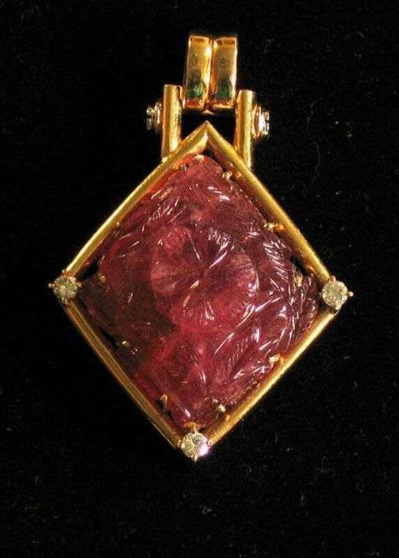 Triangular shape with floral-carved cabochon tourmaline, and three small diamonds at corners.