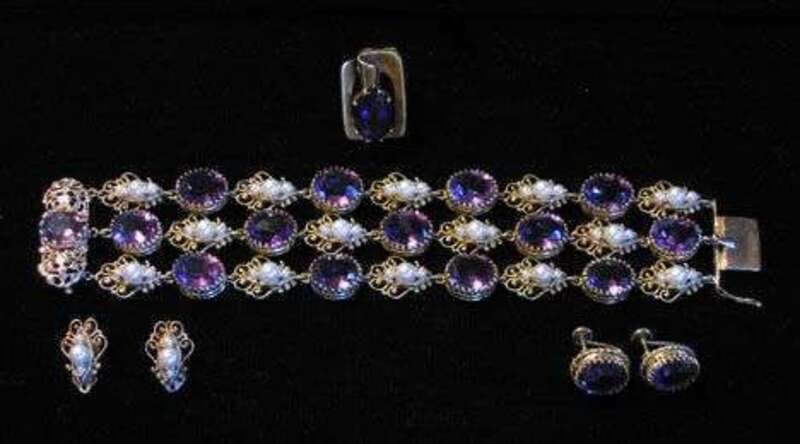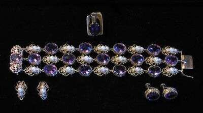 Including a flexible triple strand bracelet set with oval amethysts and graduated cultured pearls, as well as two pairs of earrings and a ring.