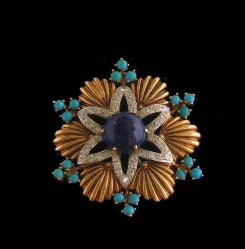 18 karat yellow gold lapis turquoise and diamond brooch